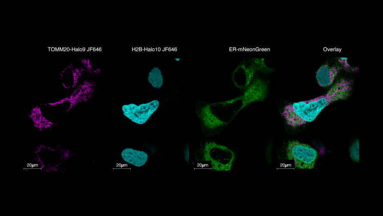U-2OS cells expressing differentially labeled proteins were examined by the superresolution approach STED, and its FLIMsupported variant TauSTED, to visualize membranous structures and protein interactions, such as the endoplasmic reticulum (ER-mNeonGreen), peroxisomes (YFP-SKL), mitochondrial outer membrane (TOMM20-Halo9), histones (H2B-Halo10) and tubulin (SiR-Tubulin), which showed high viability and structural integrity. In addition, ER, tubulin, and mitochondria dynamics as well as mitochondrial fusion and fission processes (Drp1-SNAP + SiR-SNAP) could be observed, which is a proven success for the Cellbox™ overnight transport from University Bielefeld to the Leica demonstration site in Mannheim.